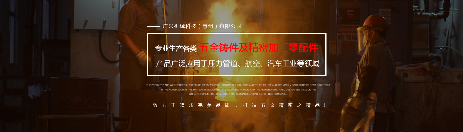 公司專業生產各類五金鑄件及精密加工零配件,可熔煉材質為全系列不銹鋼及碳鋼,主要生產材質有304、316、316L、17-4430409等,年生產各種不銹鋼鑄件1000余噸。產品廣泛應用于壓力管道、航空、汽車工業等領域,主要銷往美國、德國、新加坡、法國、荷蘭等世界發達國家,固定客戶有世界500強艾默生集團及德國啤酒桶配件公司。